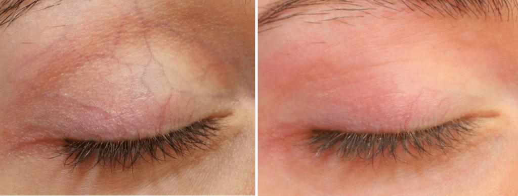 Bien que la demande ne soit pas très fréquente, les veinules bleues visibles en transparence à travers la peau des paupières peuvent être supprimés par le laser Nd:YAG.
